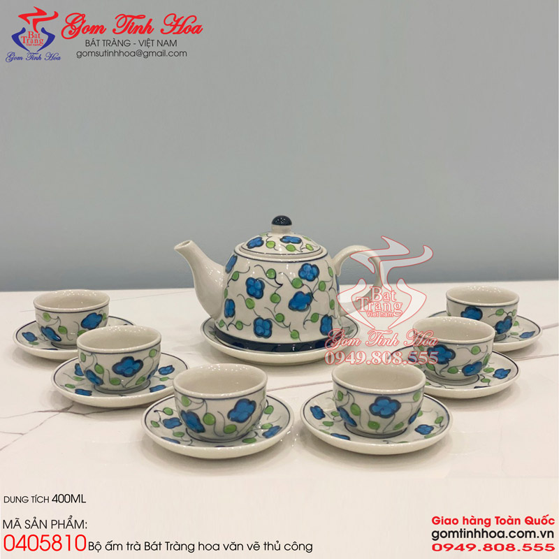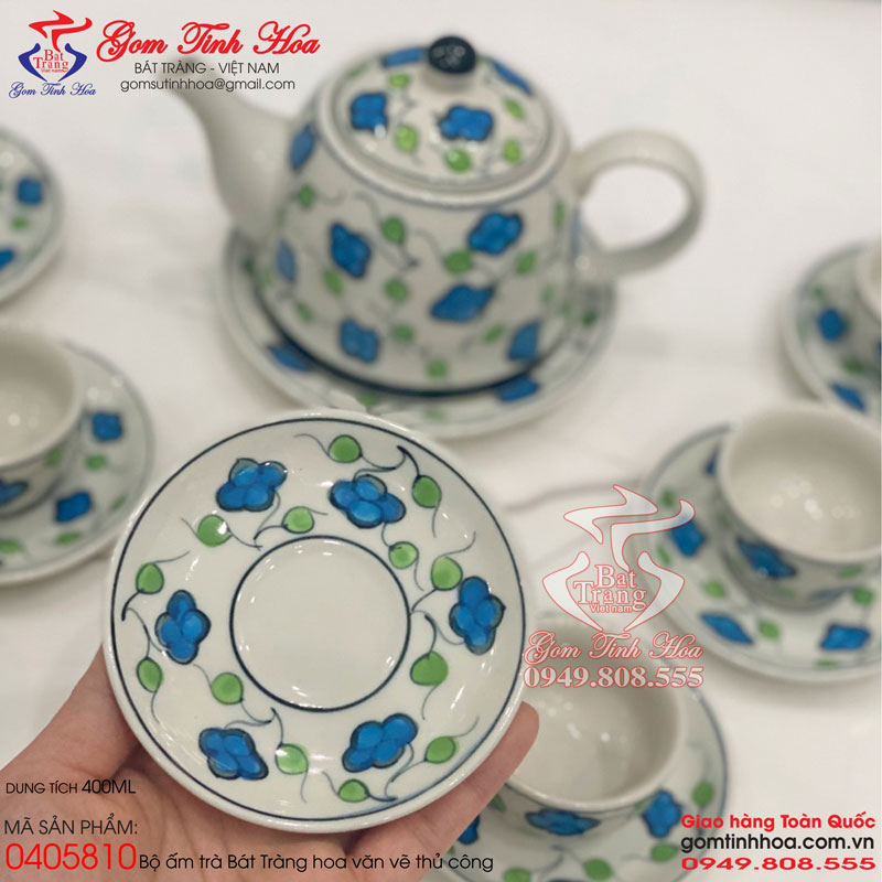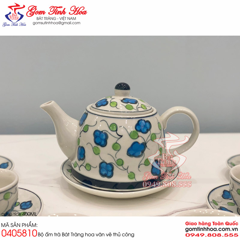 Ấm chén quai sứ vẽ cỏ bốn lá gốm sứ Bát Tràng cao cấp. Ấm chén sứ đẹp, chất liệu gốm sứ cao cấp với họa tiết hoa văn vẽ tay 100%. Dung tích ấm trà 400ml. Bộ sản phẩm gồm 1 ấm trà, 6 chén trà và 7 đĩa sứ. Sản phẩm có nguồn gốc xuất xứ Bát Tràng và được cung cấp sỉ lẻ bởi Gốm Tinh Hoa Bát Tràng.