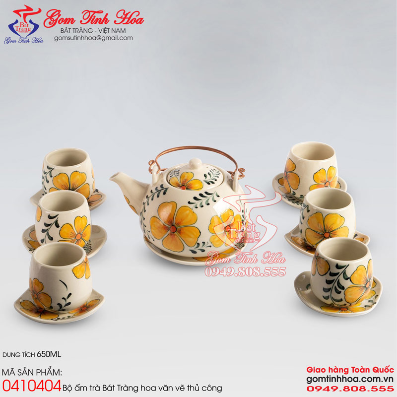 Bộ ấm trà Tống quai đồng vẽ hoa mai vàng gốm sứ Bát Tràng cao cấp. Bộ ấm trà đẹp, quai bằng đồng đúc, họa tiết hoa văn 100% vẽ tay thủ công thuần túy. Dung tích bộ ấm trà 650ml, cốc trà to, có thể dùng để pha trà Lipton, Dilmah. Bộ sản phẩm gồm 1 ấm trà, 6 cốc uống trà và 6 đĩa sứ cùng kiểu cách hoa văn. Sản phẩm có nguồn gốc xuất xứ Bát Tràng và được cung cấp sỉ lẻ bởi Gốm Tinh Hoa Bát Tràng.