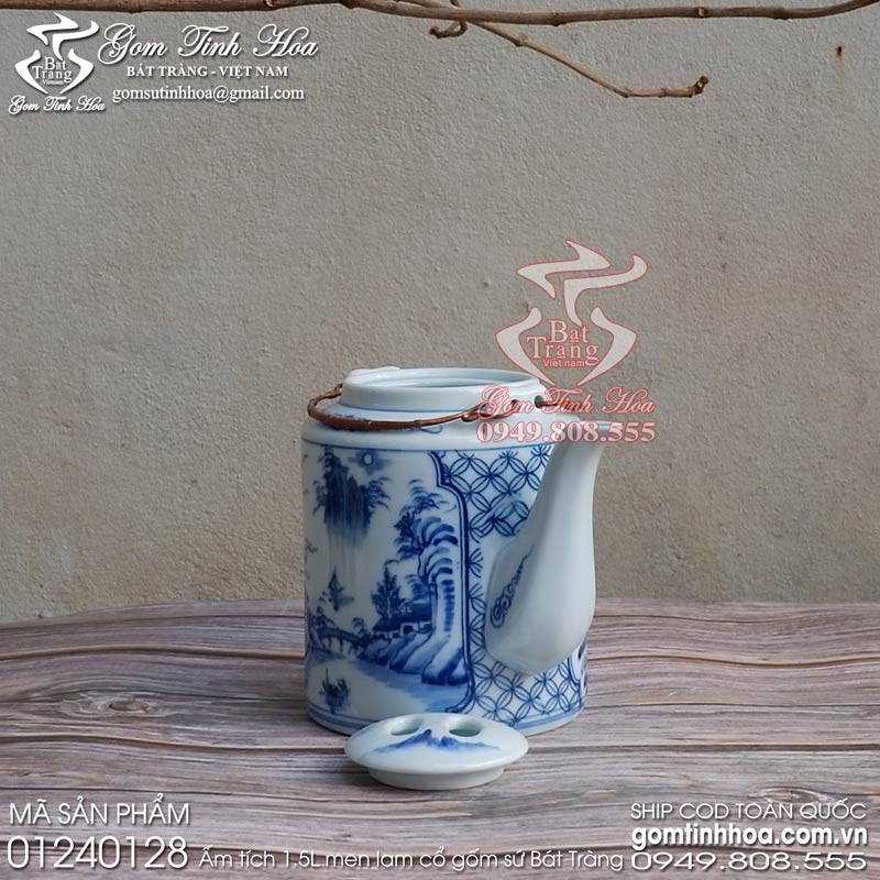 Ấm tích 1.5 lít men lam cổ sơn thủy hoa chanh gốm sứ Bát Tràng cao cấp. Ấm tích đẹp, chất liệu gốm sứ cao cấp, men màu lam đặc sắc với chất lượng tuyệt hảo, ko bám dính cặn nước chè, dễ dàng cọ rửa, dễ dàng vệ sinh, quai ấm bằng đồng nguyên chất. Dung tích ấm tích 1500ml. Sản phẩm có nguồn gốc xuất xứ Bát Tràng và được cung cấp sỉ lẻ bởi Gốm Tinh Hoa Bát Tràng.