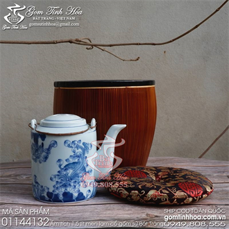 Ấm tích Bát Tràng men lam cổ kèm giỏ ủ bọc gấm Gốm Tinh Hoa Bát Tràng