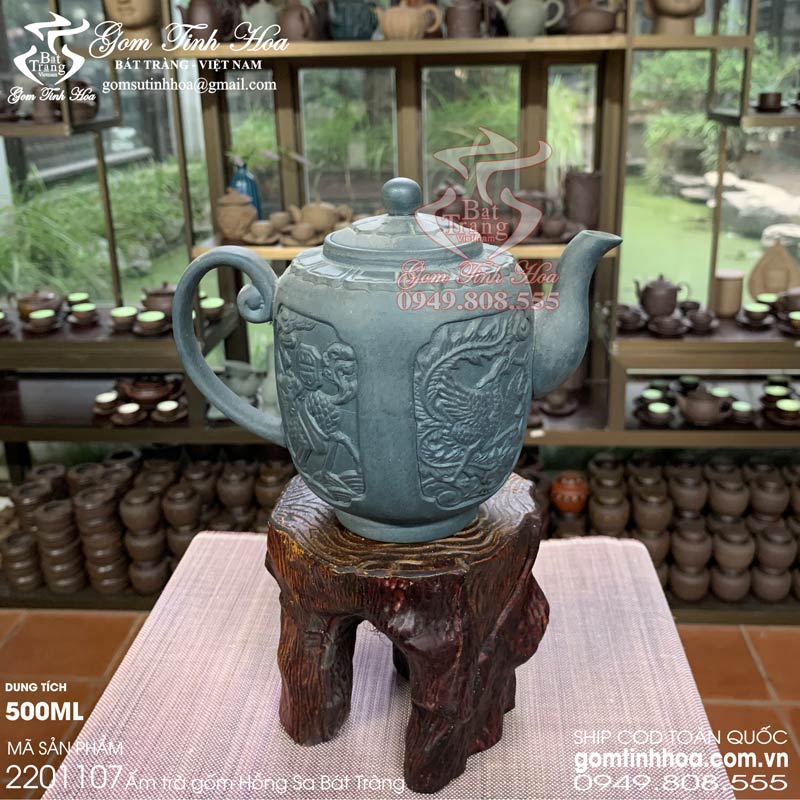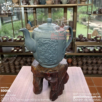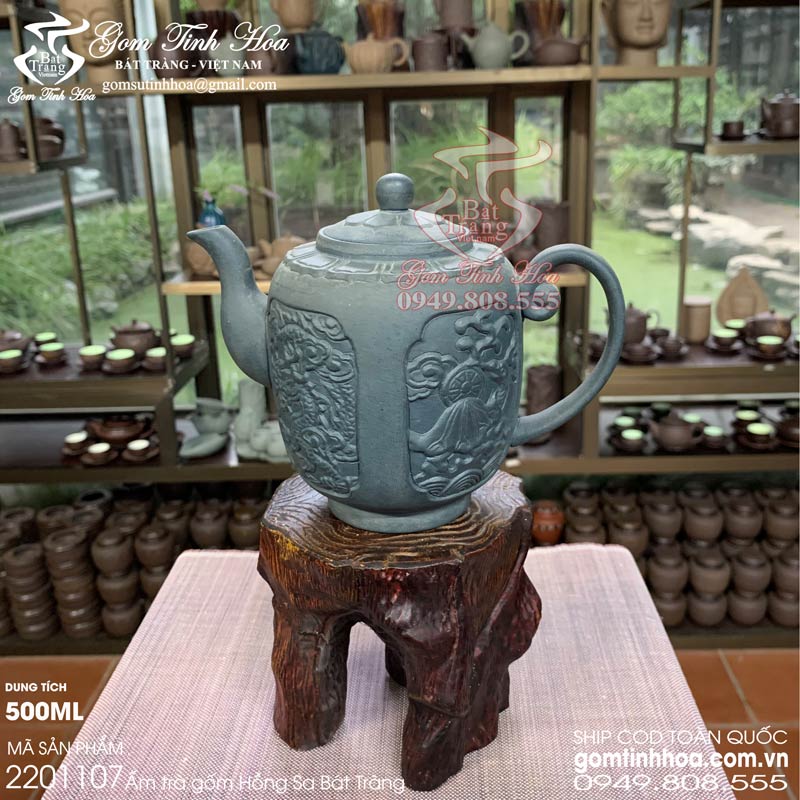 Ấm trà gốm hồng sa 500ml tứ linh nổi sắc xanh Bỉ