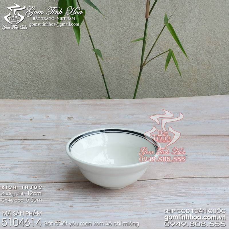 Bát chiết yêu men kem kẻ chỉ miệng gốm sứ Bát Tràng cao cấp. Bát chiết yêu đẹp, chất liệu sứ cao cấp tráng nước men kem, bát trơn không hoa văn miệng bát kẻ 2 đường chỉ màu đen. Chỉ miệng bát là chỉ màu ẩn dưới men nên sản phẩm an toàn vệ sinh, sử dụng được ở lò vi sóng và máy rửa bát. Sản phẩm có nguồn gốc xuất xứ Bát Tràng và được cung cấp bởi Gốm Tinh Hoa Bát Tràng.