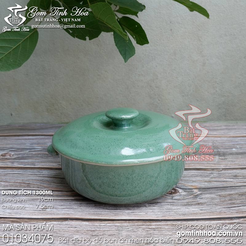 Thố sứ có nắp đường kính 18cm men hỏa biến sao xanh thuộc bộ sản phẩm Bát đĩa bộ đồ ăn gốm sứ men hỏa biến Gốm sứ Bát Tràng cao cấp. Thố sứ đẹp, kiểu dáng và men hỏa biến sao xanh đặc sắc, các kết tinh như những vì sao lấp lánh trên nền men màu xanh ngọc. Sản phẩm có nguồn gốc xuất xứ Bát Tràng và được cung cấp sỉ lẻ bởi Gốm Tinh Hoa Bát Tràng.