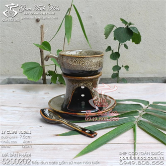 Bộ ly tách cafe đốt nến men hỏa biến màu gấm gốm sứ Bát Tràng cao cấp. Ly tách cà phê nóng chuyên dụng, thiết kế bộ sản phẩm gồm 1 ly sứ uống cà phê, 1 bếp sứ, 1 đĩa sứ và 1 thìa cafe gốm sứ; nhiên liệu đốt nóng là nến viên không khói. Bộ ly tách cà phê đẹp, chất liệu gốm sứ cao cấp với dòng men hỏa biến đẳng cấp và sang trọng, màu sắc tự nhiên, long lanh như gấm dệt. Sản phẩm có nguồn gốc xuất xứ Bát Tràng và được cung cấp sỉ lẻ bởi Gốm Tinh Hoa Bát Tràng.