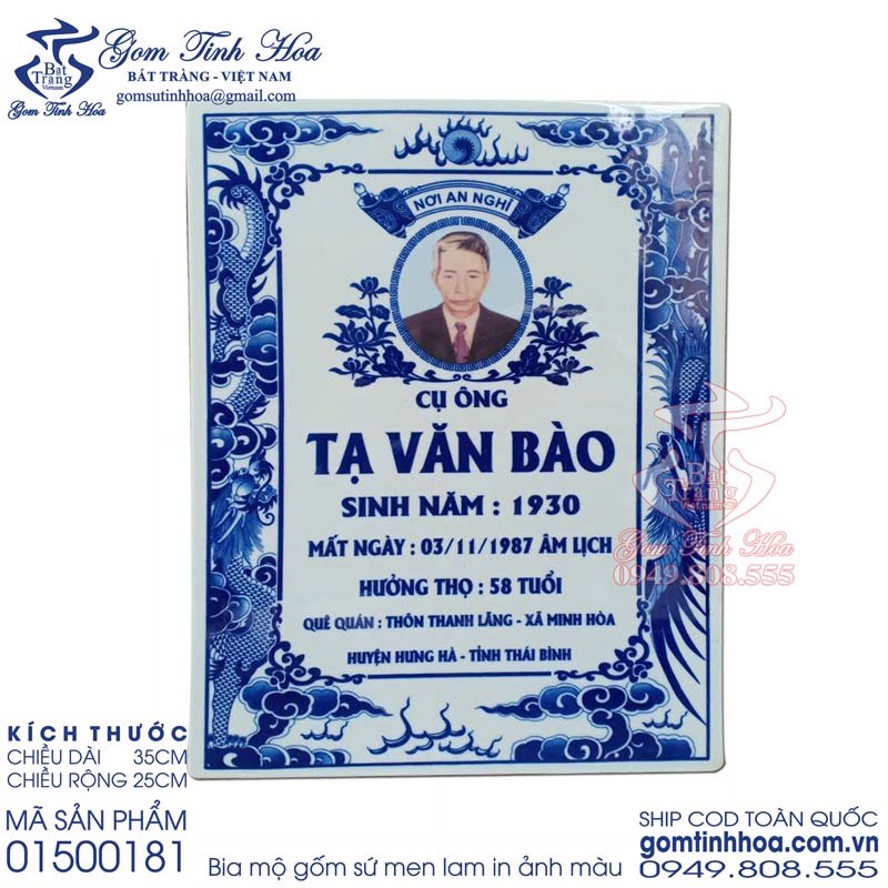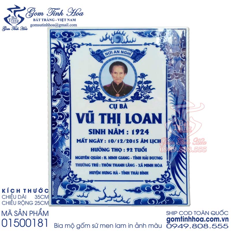 Bia mộ gốm sứ men lam in ảnh màu Gốm Tinh Hoa Bát Tràng