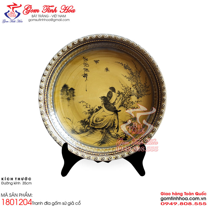 Đĩa tranh giả cổ gốm sứ Bát Tràng cao cấp. Đĩa sứ đẹp, đường kính đĩa sứ 35cm, họa tiết hoa văn chim hoa được thể hiện thủ công tinh tế với màu men nước dưa cổ đặc sắc. Bộ sản phẩm gồm 1 đĩa sứ và 1 chân kê bằng gỗ. Sản phẩm có nguồn gốc xuất xứ Bát Tràng và được cung cấp sỉ lẻ bởi Gốm Tinh Hoa Bát Tràng.