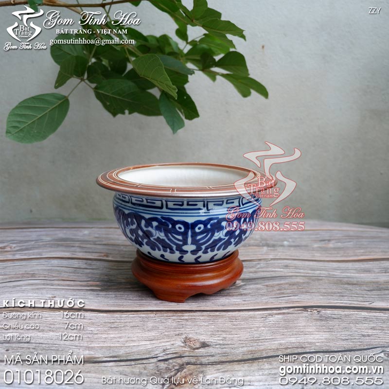 Bát hương quả lựu men lam cổ vẽ Lan Đằng Gốm Tinh Hoa Bát Tràng