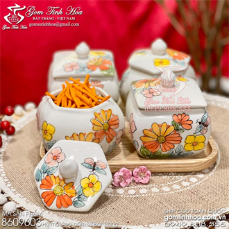 Set 4 hũ mứt tết gốm sứ Bát Tràng cao cấp vẽ hoa đồng nội