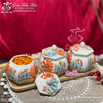 Bộ 3 hũ mứt tết lục giác gốm sứ Bát Tràng vẽ hoa đồng nội